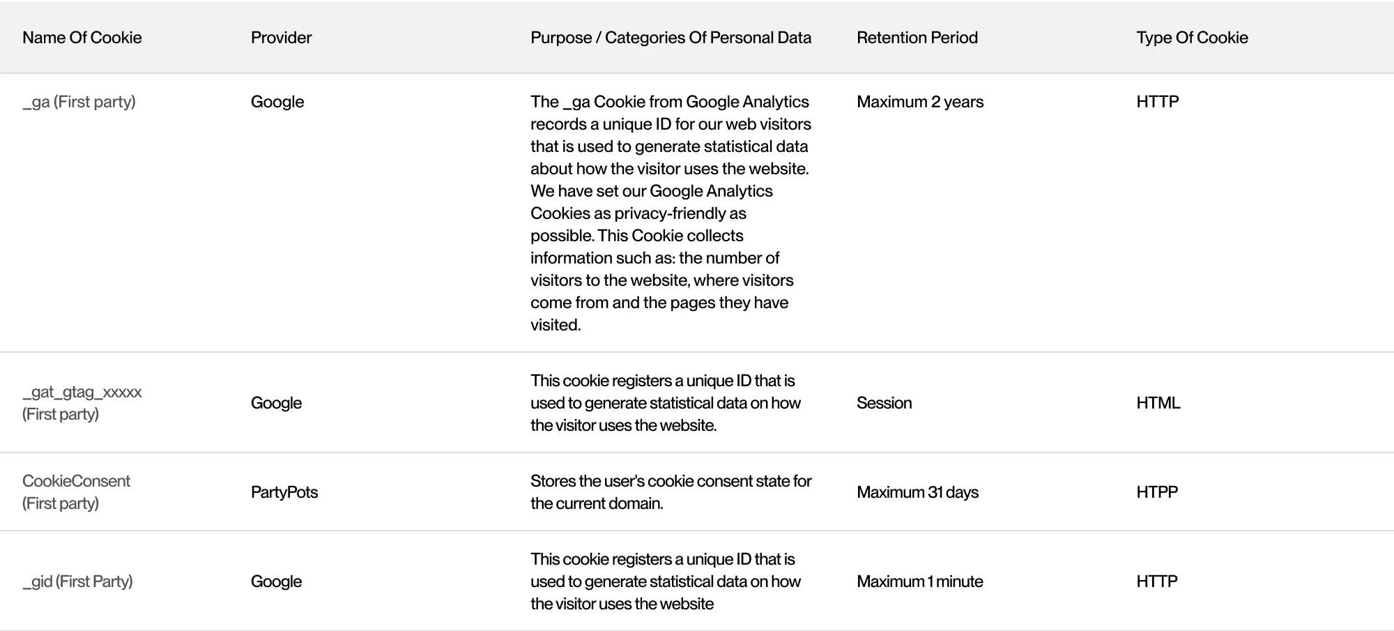 Please check our Cookie table below for more detailed information about our (use of) Cookies, the Purposes they serve and which Retention period we have set for these Cookies while using them.